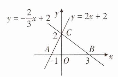 8. 如图,直线y = 2x + 2和直线y = -$\frac{2}{3}x + 2$分别与x轴交于A(-1,0)和B(3,0)两点,与y轴交于同一点C(0,2).