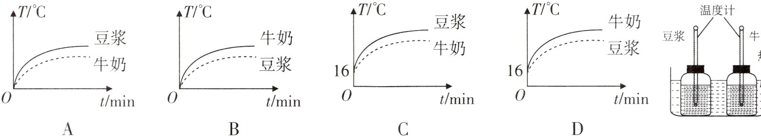 7. 如图,在两个大小相同的塑料瓶中分别装入质量相同且初始温度均为16℃的豆浆和牛奶,同时浸入100℃的热水中加热相同的时间。已知豆浆比牛奶的温度升高得快,则上述实验的一段时间内,豆浆和牛奶的温度T(℃)随加热时间t(min)变化的图象是 ( )