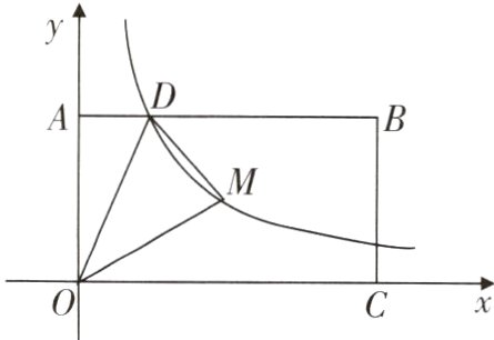 1.如图,矩形OABC的顶点A,C分别在y轴、x轴的正半轴上,点D在AB上,且AD = $\frac{1}{4}$AB,反比例函数y = $\frac{k}{x}$(k ≠ 0)的图象经过点D及矩形OABC的对称中心M.连接OD,OM,DM.若△ODM的面积为3,则k的值为______.
