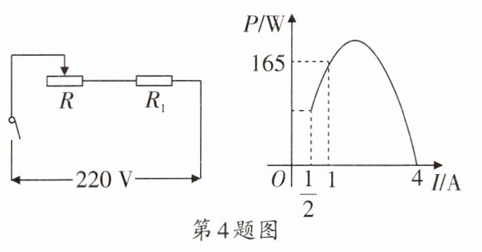 4. 新课标跨学科整合 某物理兴趣小组对一款饮水机的工作电路展开研究,将变阻器R的滑片从一端滑到另一端,绘制出变阻器R消耗的电功率P随电流I变化的关系图象如图所示。该图象是经过原点的一条抛物线的一部分,则变阻器R消耗的电功率P最大为______W。