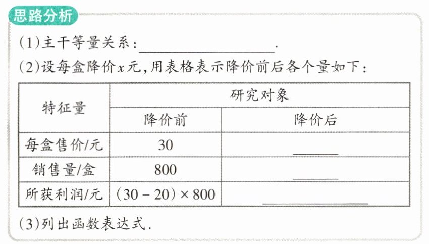 由题可得y = (30 - x - 20)(800 + 200x)=(10 - x)(800 + 200x),