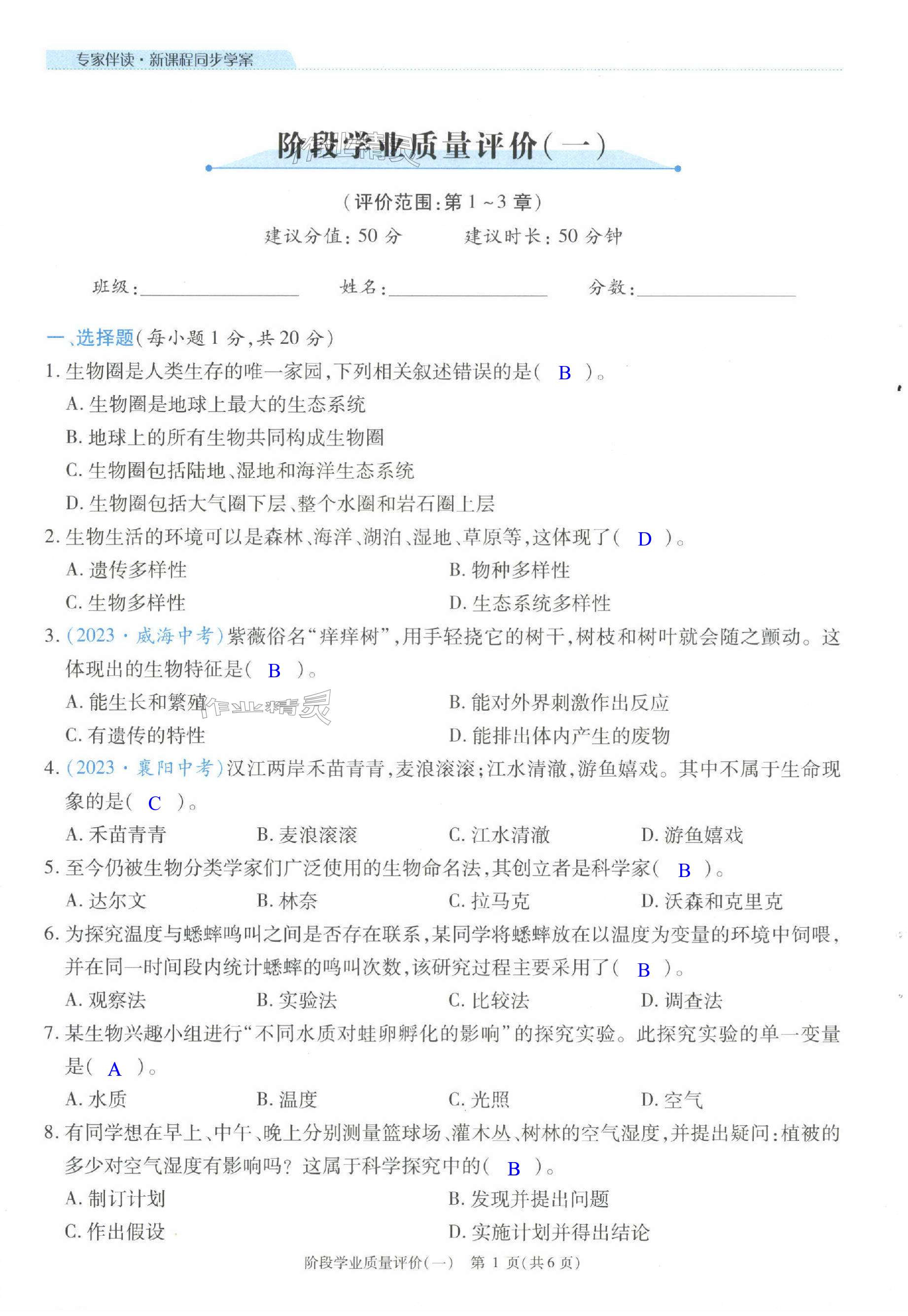 注:目前有些书本章节名称可能整理的还不是很完善,但都是按照顺序排列的,请同学们按照顺序仔细查找。练习册 2024年新课程同步学案七年级生物上册北师大版 答案主要是用来给同学们做完题方便对答案用的,请勿直接抄袭。