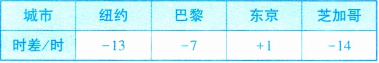 15. (★★)下表列出了国外几个城市与北京的时差(带正号的数表示同一时刻比北京早的时数,比如,北京时间早上$9:00$时,巴黎时间为凌晨$2:00$)。
