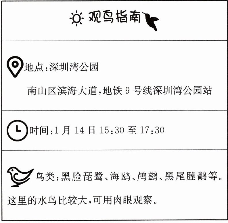(2)观鸟过程中,你发现小深将随身携带的零食投喂给海鸥。结合观鸟指南,你会怎样劝说他。