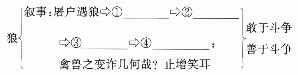 狼$\left\{\begin{array}{l}叙事:屠户遇狼\Rightarrow①______\Rightarrow②______\\ \Rightarrow③______\Rightarrow④______:禽兽之变诈几何哉?止增笑耳\end{array} \right\}$敢于斗争善于斗争