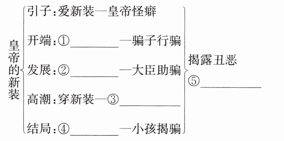 $\begin{cases}引子:爱新装—皇帝怪癖 \\\begin{cases}开端:①______—骗子行骗 \\发展:②______—大臣助骗 \\高潮:穿新装—③______ \\结局:④______—小孩揭骗\end{cases}