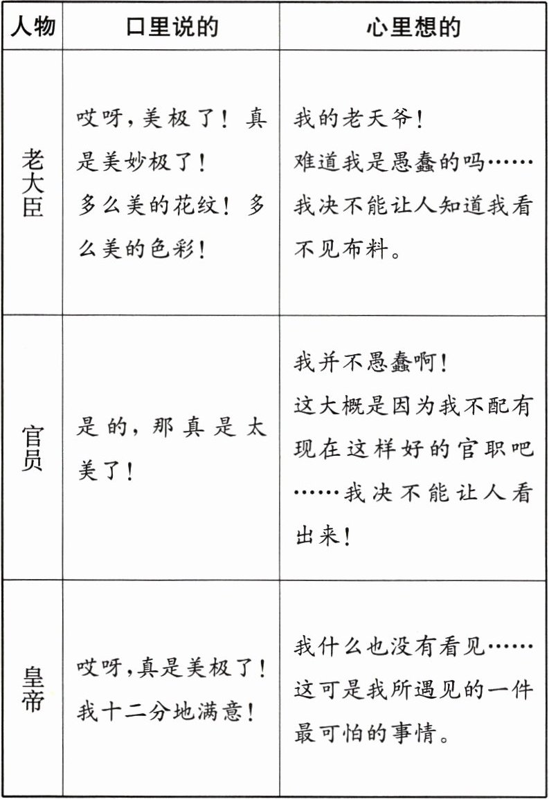 |老大臣|哎呀,美极了!真是美妙极了!多么美的花纹!多么美的色彩!|我的老天爷!难道我是愚蠢的吗……我决不能让人知道我看不见布料。|