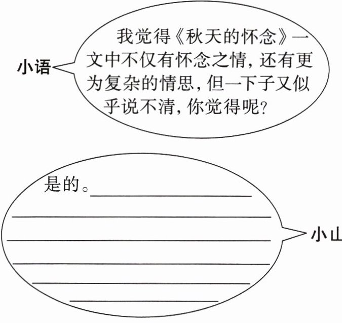 \begin{matrix}& 小语 & 我觉得《秋天的怀念》一文中不仅有怀念之情,还有更为复杂的情思,但一下子又似乎说不清,你觉得呢? & \\& 小山 & 是的。______ & \\& & ______ & \\& & ______ & \\& & ______ & \\& & ______ &\end{matrix} $