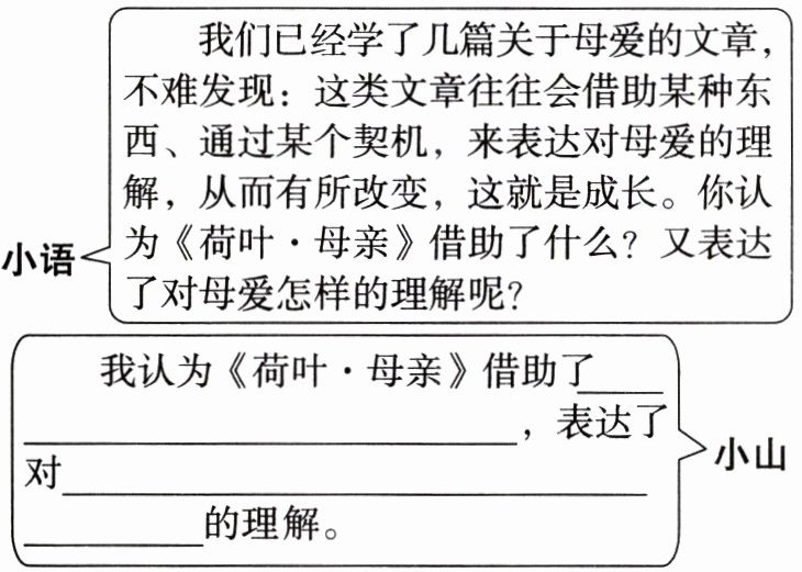 小语:我们已经学了几篇关于母爱的文章,不难发现:这类文章往往会借助某种东西、通过某个契机,来表达对母爱的理解,从而有所改变,这就是成长。你认为《荷叶·母亲》借助了什么?又表达了对母爱怎样的理解呢?
