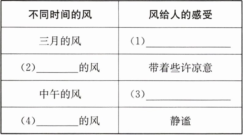 8. 文章描写了不同时间的风带给人们的感受。请根据文章内容,将表格补充完整。
