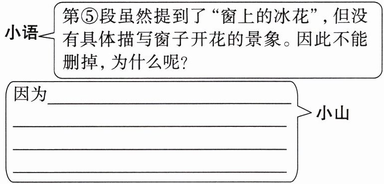 6. 阅读文章后,在班级阅读分享会上,大家展开了热烈的讨论,请你参与讨论。$\n$小语:第⑤段虽然提到了“窗上的冰花”,但没有具体描写窗子开花的景象。因此不能删掉,为什么呢$?\n$小山:因为______