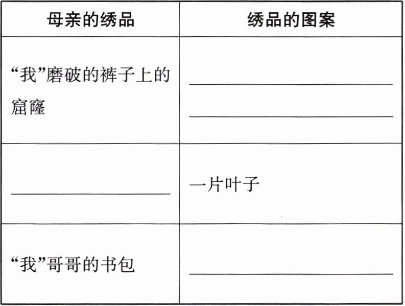④母亲灵机一动,其实,也不是灵机一动,这在母亲已成习惯了,是仅属于母亲的秘密——取来孩子们的铅笔,将那从各个方向投影下来的葫芦叶子画下来,就画在那接待影子的布上。若觉得好看,正合适点缀点什么,就依照那样式,略微放大或缩小,一针一线缝好绣好,她的艺术品就做成了。瞧,此时,被我那顽皮的膝盖磨破的裤子上的窟窿,正被一片翠绿的胖叶子补丁覆盖了,那本来寒碜的补丁,却成了有趣的、摇曳着的一片初夏的叶子。