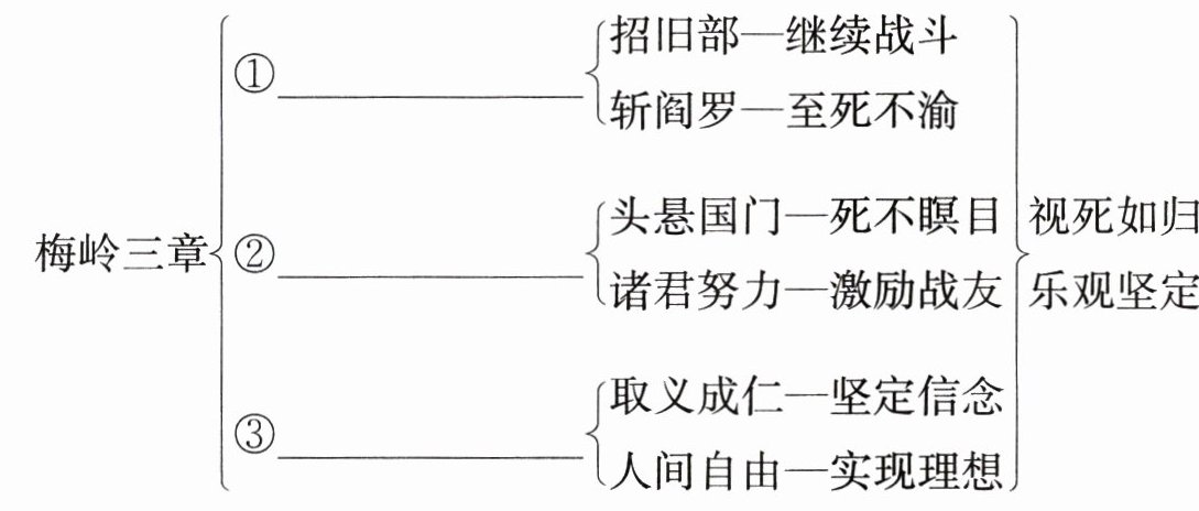 $\underline{梅岭三章}$$\begin{cases} ①\underline{\text{}} \begin{cases} 招旧部—继续战斗 \\ 斩阎罗—至死不渝 \end{cases} \\ ②\underline{\text{}} \begin{cases} 头悬国门—死不瞑目 \\ 诸君努力—激励战友 \end{cases} 视死如归 乐观坚定 \\ ③\underline{\text{}} \begin{cases} 取义成仁—坚定信念 \\ 人间自由—实现理想 \end{cases} \end{cases}$