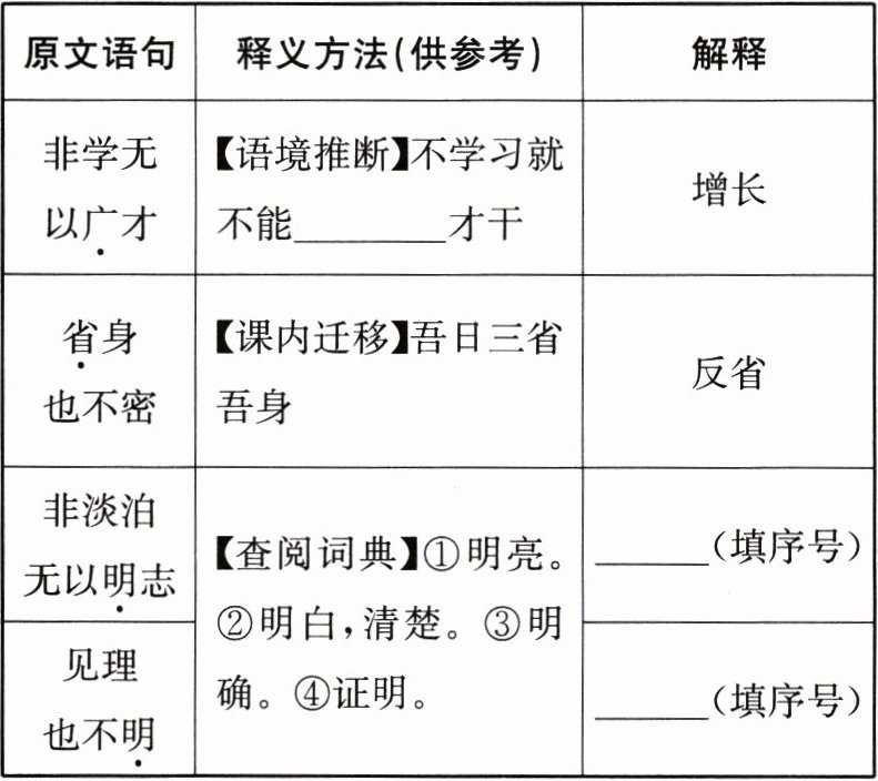 |非淡泊无以明志|【查阅词典】①明亮。②明白,清楚。③明确。④证明。| (填序号)|