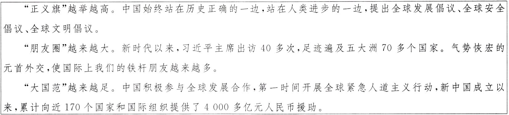 (示例)①作为一个负责任的大国,中国始终是世界和平的建设者、全球发展的贡献者、国际秩序的维护者,赢得了广泛国际赞誉,国际影响力、感召力和塑造力显著提升。②我国高举和平、发展、合作、共赢的旗帜,为推动建设相互尊重、公平正义、合作共赢的新型国际关系作着不懈的努力。③中国积极开展中国特色大国外交,推动建设新型国际关系,推动构建人类命运共同体,弘扬和平、发展、公平、正义、民主、自由的全人类共同价值,引领人类进步潮流。④中国积极参与全球治理体系建设和改革,在有关世界和平与发展的各个领域,积极采取行动。⑤中国着眼于时代发展大势,遵循共商共建共享原则,为全球治理提出中国方案,贡献中国智慧。⑥中国在解决人类面临的各种问题的过程中积极探索、有效行动,发挥负责任大国作用,促进人类社会共同发展。⑦中国在推动国际秩序朝着更加公正合理的方向发展,更好维护我国和广大发展中国家共同利益的同时,坚持以经济建设为中心,集中力量办好自己的事情,不断增强我们在国际上说话办事的实力。(答出三点即可,6分)