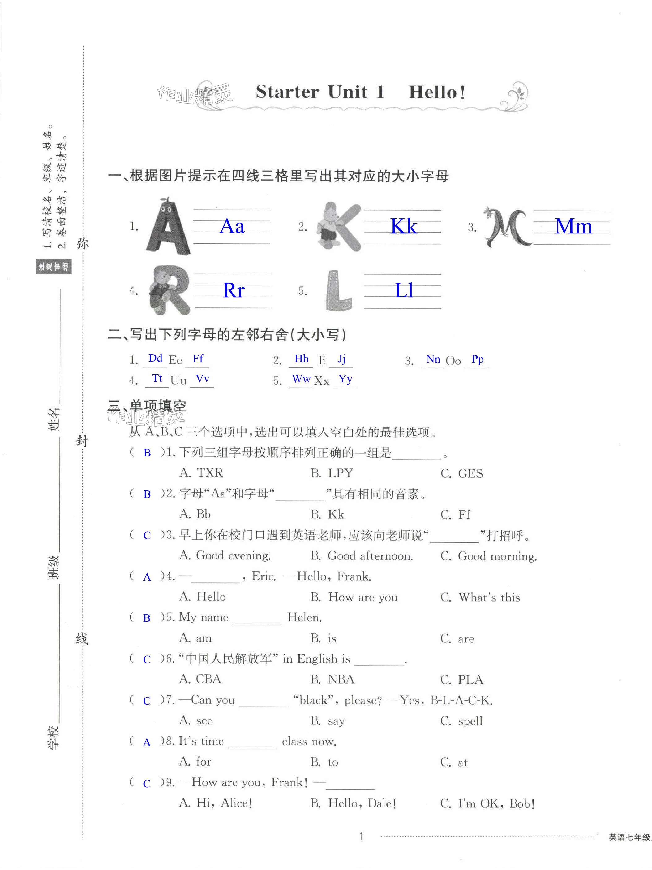 注:目前有些书本章节名称可能整理的还不是很完善,但都是按照顺序排列的,请同学们按照顺序仔细查找。练习册2024年同步练习册配套单元检测卷七年级英语上册人教版答案主要是用来给同学们做完题方便对答案用的,请勿直接抄袭。