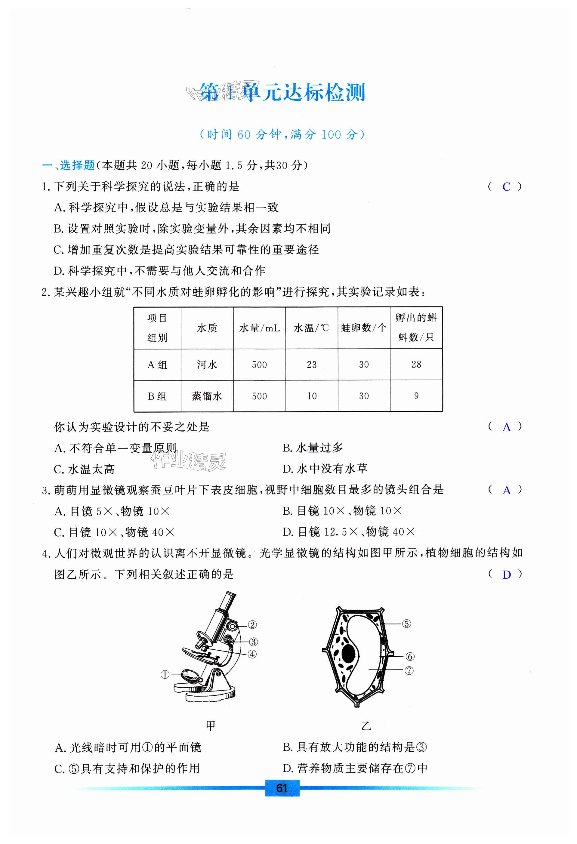 注:目前有些书本章节名称可能整理的还不是很完善,但都是按照顺序排列的,请同学们按照顺序仔细查找。练习册 2024年学习检测七年级生物上册苏教版 答案主要是用来给同学们做完题方便对答案用的,请勿直接抄袭。