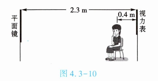 |平面镜成像的应用|(1)如图 4.3 - 10 所示,小敏检查视力时,视力表放在她头部的后上方,她识别对面墙上镜子里视力表的像。视力表在镜中的像到小敏的距离为______m,当她走近平面镜时,镜中像的大小将______(填“变大”“变小”或“不变”)。