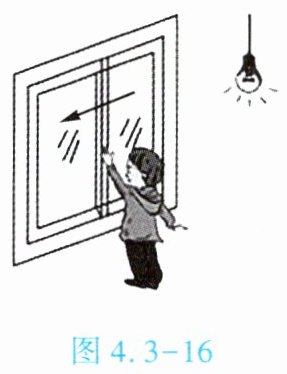 1. (★★)晚上,小明在客厅的窗户玻璃上看到了客厅里灯的像,这是光的______(填“直线传播”或“反射”)现象。如图 4.3 - 16 所示,水平向左缓慢推动玻璃窗,则小明通过玻璃窗看到的像______(填“向左运动”“向右运动”或“静止不动”),像的大小______(填“变大”“变小”或“不变”)。