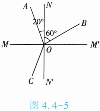 3. (★★)一束光在玻璃和空气两种物质中传播,在分界面发生了反射和折射,如图4.4 - 5所示,$MM'和NN'$互相垂直,是分界面或者法线,其他为光线。根据图中角度关系可知,______是法线,此时的入射角为______$^{\circ}$,折射角为______$^{\circ}$,界面的______边是玻璃。