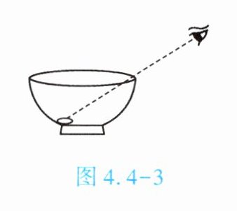 3. (★★)《康熙几暇格物编》中记载:“置钱碗底,远视若无,及盛满水时,则钱随水光而显现矣。”如图4.4 - 3所示,把硬币放在碗底,后退到眼睛恰好看不到硬币,保持眼睛、碗和硬币的位置不变,缓缓向碗里倒水,又再次看到硬币,这是光从______射向______(两空均填介质名称)发生______现象造成的,再次看到的是硬币的______(填“实像”或“虚像”)。