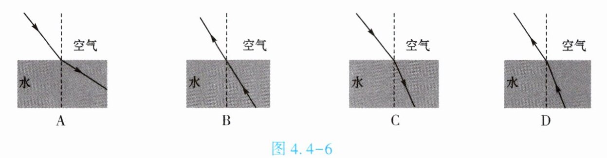 4. (★★)去年暑假,小梦陪着爷爷到湖里去叉鱼。小梦将钢叉向看到鱼的方向投掷,总是叉不到鱼。如图4.4 - 6所示的四幅光路图中,能正确说明叉不到鱼的原因的是【 】
