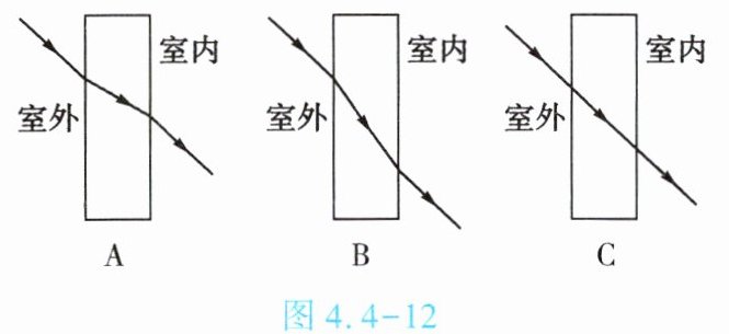 (2)如图4.4 - 12中,能真实反映太阳光线通过玻璃幕墙进入室内的传播途径的是______(填字母)。