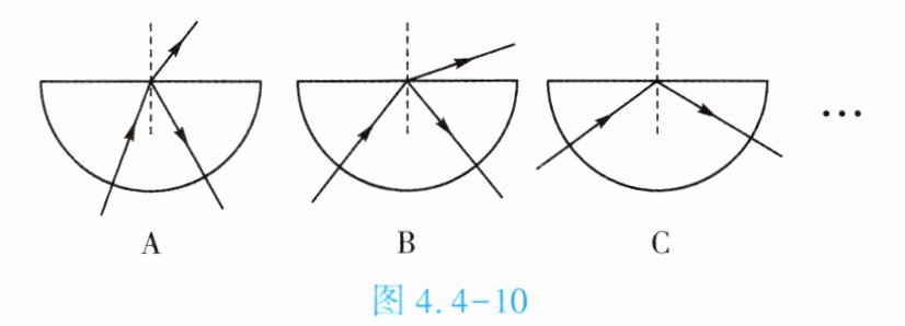 9. (★★★)小明做了如下实验:如图4.4 - 10所示,让一束光沿半圆形玻璃砖的半径射到直边上,可以看到一部分光线从玻璃砖的直边上射到空气中,此时折射角______入射角,另一部分光反射到玻璃砖内。逐渐增大光的入射角,将看到折射光线离法线越来越______,而且越来越弱,反射光线越来越强。当入射角增大到某一角度,使折射角达到$90^{\circ}$时,______光线就消失了,只剩下______光线。他把这个发现与小刚进行了交流,最后他们去请教老师,老师告诉他们这种现象叫作全反射,折射角变成$90^{\circ}$时的入射角,叫临界角。他又用水进行了实验,得出了同样的结论。