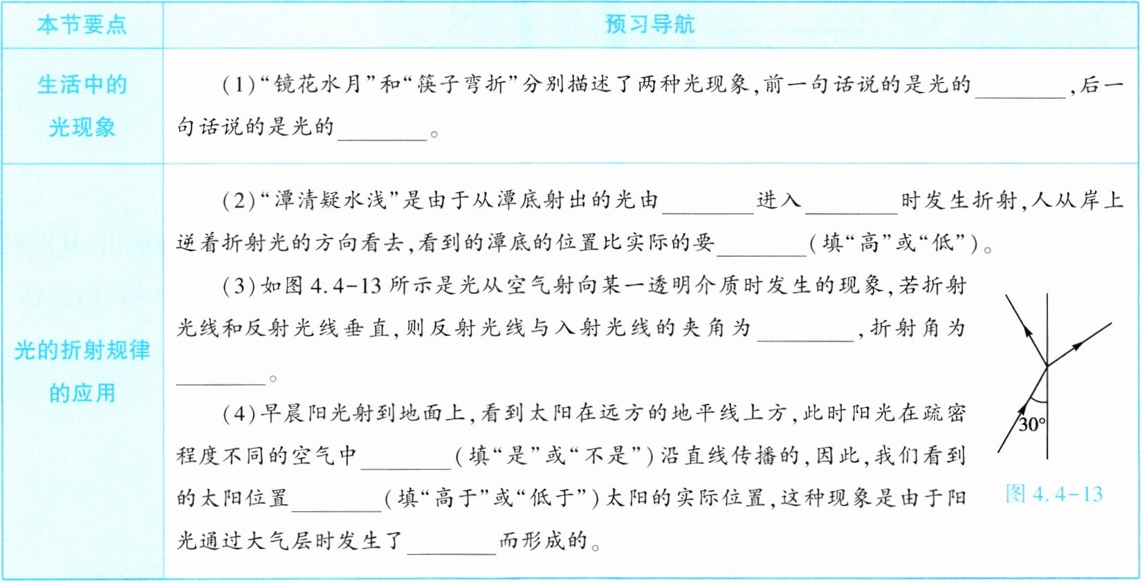 (3)如图4.4-13所示是光从空气射向某一透明介质时发生的现象,若折射光线和反射光线垂直,则反射光线与入射光线的夹角为____,折射角为____。