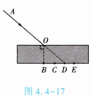 5. (★★)如图4.4-17所示,一束激光AO从空气斜射入玻璃砖,折射后从另一面射出,其出射点可能为图中____(填字母)点;若增大入射角,出射点的位置会____(填“向左移”“向右移”或“不变”)。