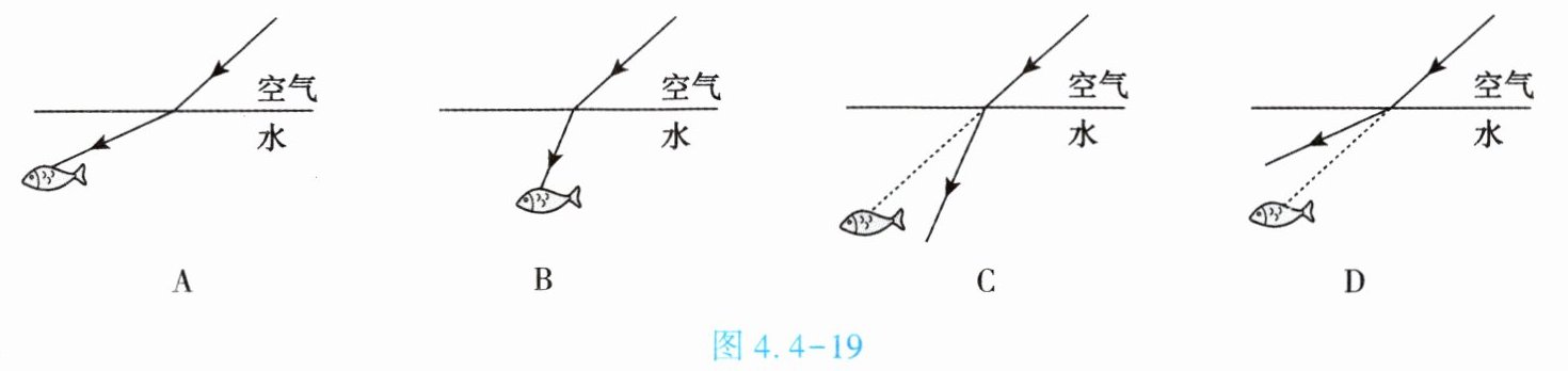 3. (★★)小司学习了光的折射规律后,在水面上用激光笔照射到水中的鱼,图4.4-19中能够正确表达激光在水面发生折射的光路的是【 】