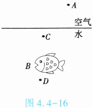 4. (★★★)如图4.4-16所示,渔夫的眼睛在空气中的A处看到水中B处有一条鱼,眼睛看到的是鱼的____(填“虚像”或“实像”),真正的鱼在____(填“C”或“D”)处。这是由于光从水中斜射入空气中时发生折射,折射角____(填“小于”“等于”或“大于”)入射角造成的。若在A处发射一束激光照亮真正的鱼,光束应朝向____(填“B”“C”或“D”)处。