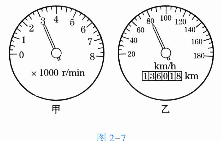 20. 小明利用假日到凯里玩,汽车行驶了一会儿,他看到了如图2-6所示标志。他想知道此时汽车行驶的速度是多少,便观察了有关仪表,如图2-7所示。