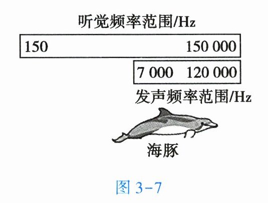 11. 正常灰鲸的发声频率范围为15 Hz~25 Hz。生物学家发现变异灰鲸Alice,其发声频率为52 Hz,导致正常灰鲸“听不见”Alice的声音,如图3-7所示为海豚的发声频率和听觉频率范围,灰鲸与海豚同属海洋哺乳动物。由此推理:正常灰鲸听觉频率范围(黑色横条)很可能是【 】