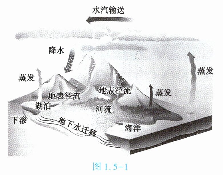 1. (★★)图 1.5 - 1 是自然界中水循环的示意图。在一定条件下,云中小水滴和小冰晶越来越大,就会下落,在下落过程中,小冰晶又变成了小水滴,与原来的水滴一起落到地面,就形成了雨,小冰晶的熔化过程需______热。