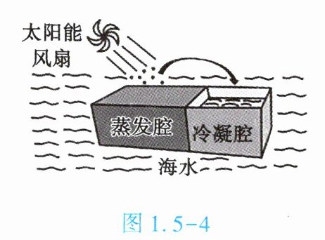 4. (★★)某海水淡化系统(如图 1.5 - 4 所示)工作时,蒸发腔中的水在光热作用下变成______,太阳能风扇将______吹到冷凝腔内冷凝,变成______,实现海水淡化。