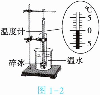 3. (★★)(2023·江苏无锡)用如图 1 - 2 所示的装置探究冰的熔化特点,将装有适量碎冰的试管置于烧杯内的温水中,冰______(填“吸收”或“放出”)热量,温度升高。当冰开始熔化时,温度计的示数如图所示为______$^{\circ}C$,冰在熔化过程中温度计的示数______(填“改变”或“不变”),由此可知,冰属于晶体。