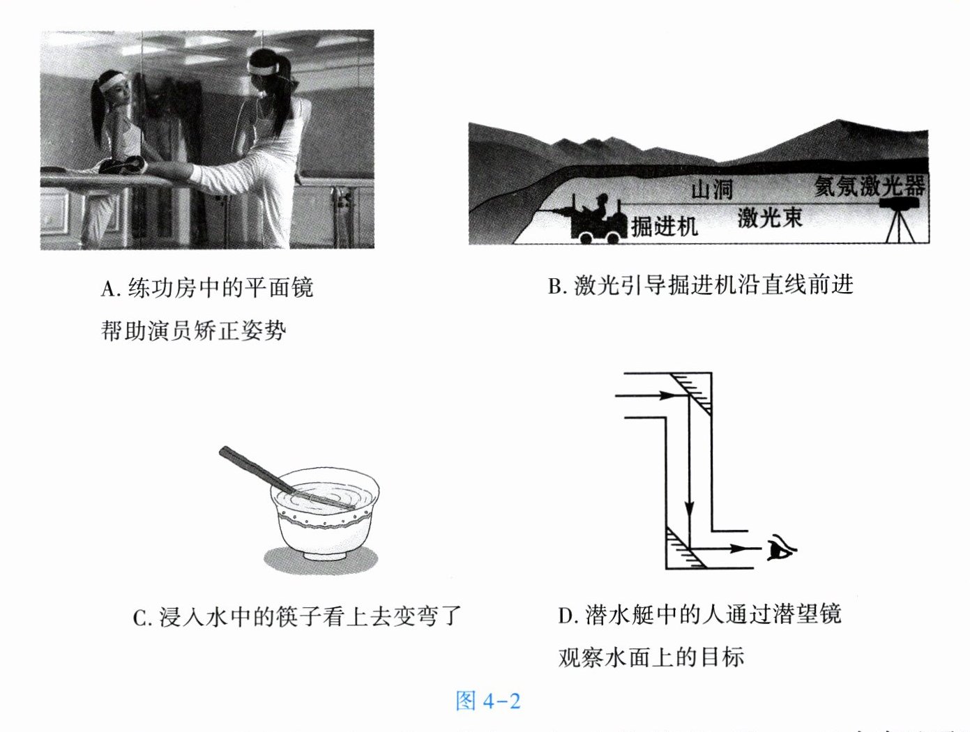 7. 图 4 - 2 的四幅图中,属于光的折射现象的是【 】