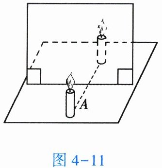 (2)如图 4 - 11 所示,将玻璃板______放置在水平白纸上,把点燃的蜡烛 $ A $ 放在玻璃板的前面,能看到它在玻璃板后面的像。再拿一支与蜡烛 $ A $ 完全相同的蜡烛 $ B $,竖立着在玻璃板后面移动,直至与蜡烛 $ A $ 的像完全重合,此现象说明______。
