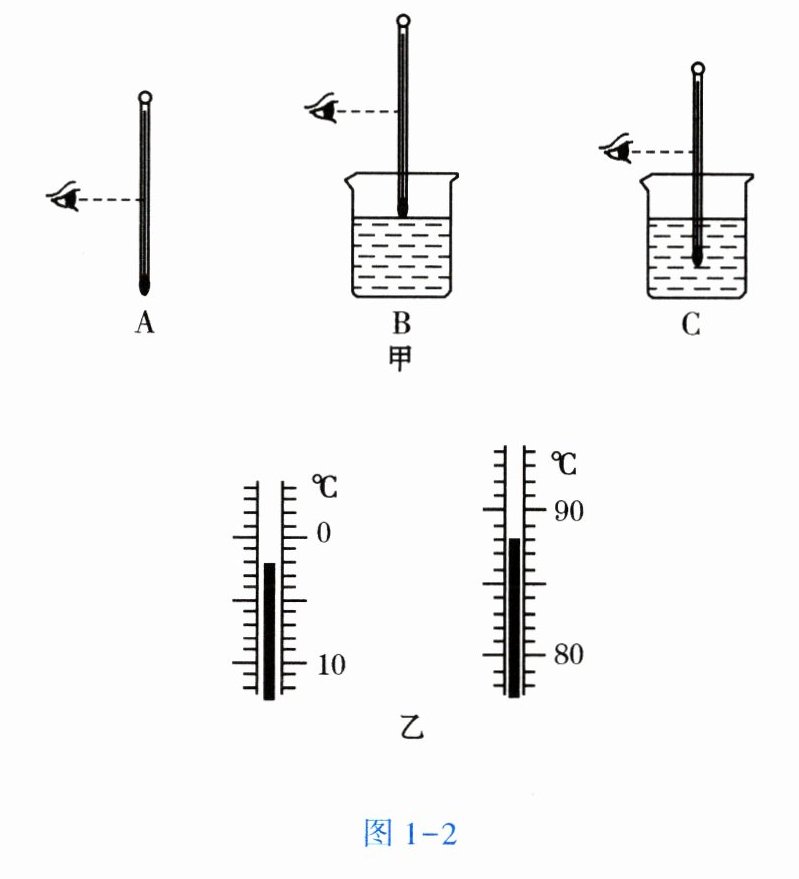 15. 小明用温度计测量烧杯中液体的温度,分别进行了三次操作,如图 1-2 甲所示,其中正确的操作是______(填字母)。图 1-2 乙所示的是用温度计分别测得的冰和水的温度,那么水的温度是______℃。