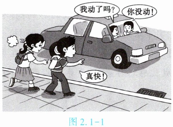 1. (★)放学路上,小明和小红沿人行道步行,一辆汽车从他们身旁疾驰而过,如图 2.1 - 1 所示。司机说“你没动”是选定了______为参照物;小明说车“真快”是选定了______为参照物。