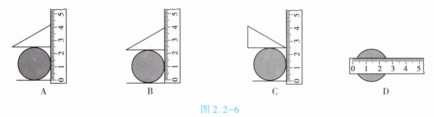 7. (★★)如图2.2 - 6所示,利用直尺和三角板测量一个圆柱体的直径,其中方法正确的是【 】