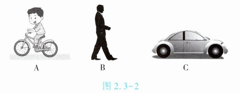 4. ($\star\star$)如图 2.3 - 2 所示,______的速度约为 $1.2m/s$,______的速度约为 $30m/s$,______的速度约为 $4m/s$。(均填“A”“B”或“C”)