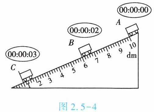 5. (★★★)(2023·四川)某物理兴趣小组用如图 2.5 - 4 所示的实验装置“测量小车运动的平均速度”。实验中,他们将小车从带刻度(分度值为 1 cm)的斜面顶端 A 点静止释放,并同时按下电子停表开始计时,图中圆圈内显示了小车位于 A、B、C 三点的时刻(数字分别表示“时:分:秒”)。