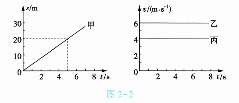 3. ($★★★$)甲、乙、丙三辆小车同时、同地向同一方向运动,它们运动的图像如图2 - 2所示,由图像可知:运动速度相同的小车是______和______;经过5s,跑在最前面的小车是______。