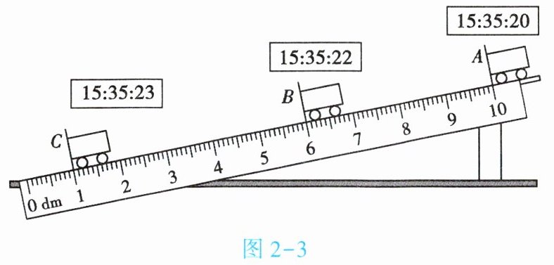5. ($★★★$)(2023·四川眉山)如图2 - 3所示,小明在“测平均速度”的实验中,使小车从斜面上的A点由静止开始下滑,经过B点到达C点,图中已标出小车经过A、B、C三点对应时刻。下列说法中正确的是【 】