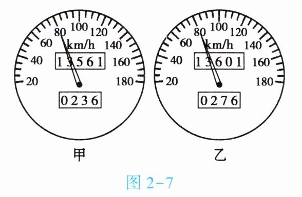 7. ($★★$)小唐一家双休日自驾外出郊游,在行驶的过程中,善于观察的小唐同学看到汽车上有一个显示速度和路程的表盘,示数如图2 - 7甲所示,则汽车此时行驶的速度为______;该车匀速行驶了一段时间后,表盘示数变为图2 - 7乙所示,那么这段时间为______h。