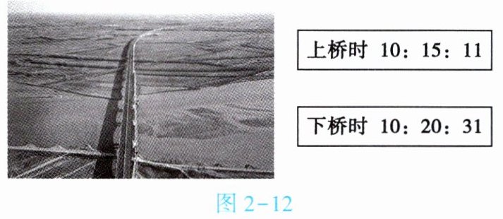 13. ($★★$)2023年12月28日,阳新高速公路黄河特大桥正式通车。阳新高速公路黄河特大桥是濮阳至湖北阳新高速公路的控制性工程,北接濮范高速,向南跨越黄河,止于菏泽市牡丹区李村镇,桥梁全长约8km,双向六车道,设计速度120km/h,对推动黄河流域和沿线经济社会高质量发展具有重要意义。暑假期间,爸爸开车带着小华通过阳新高速公路黄河特大桥时,小华用手表测量了自己通过大桥的时间,上桥和离桥时的手表示数如图2 - 12所示。求:
