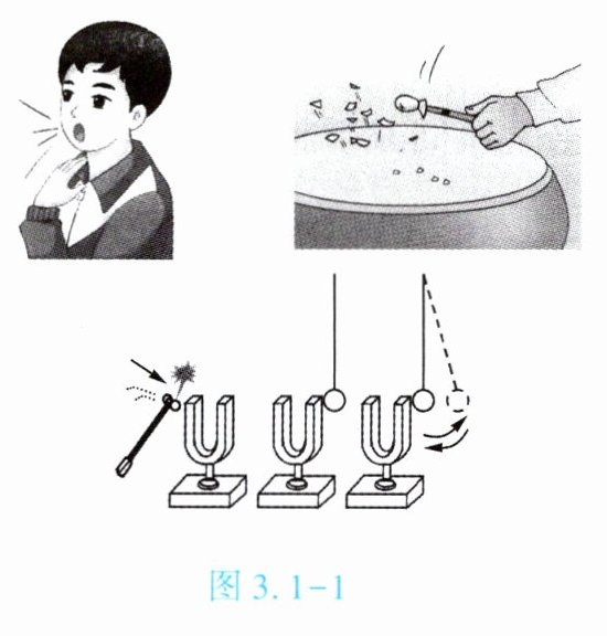 1. (★★)如图 3.1-1 所示,在你说话或唱歌时,用手摸喉头部分,手能感受到喉头部位在振动,说明发声的物体在______,说话时发声体是人的______。击鼓时在鼓面上放置一些碎纸屑,听到鼓声的同时会看到纸屑上下跳动,在鼓面上放纸屑的目的是______(填“放大”或“减小”)振动,这种研究问题的方法叫作______(填“等效替代法”或“转换法”)。敲击音叉,音叉发声,将细线悬挂的轻质小球与音叉接触,会观察到小球被弹起,用手按住正在发声的音叉,音叉不发声,小球也不会被弹起,这说明声音是由物体的______产生的,______停止,发声停止。