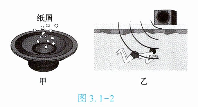 2. (★★)如图 3.1-2 所示,图甲利用纸屑振动说明纸盆在振动发声,这种研究问题的方法叫______;图乙中的游泳者在水下能听到岸上的音乐声,说明声音不仅能在空气中传播,也能在______中传播。
